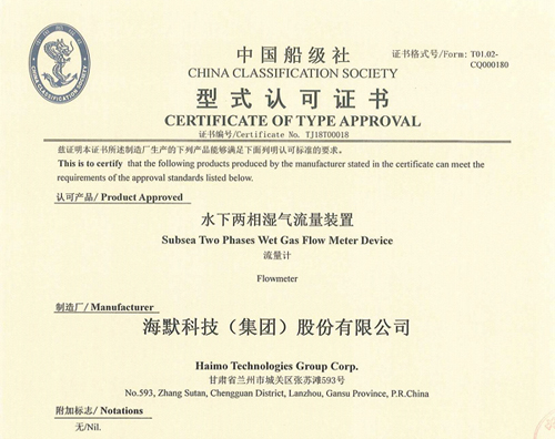 8868体育官网登录入口水下两相湿气流量装置获中国船级社(CCS)型式认证证书