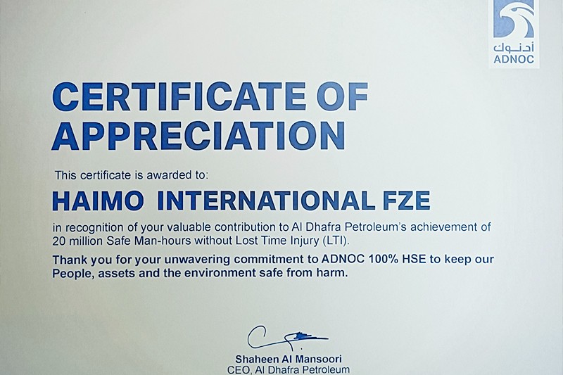 8868体育官网登录入口荣获Al Dhafra Petroleum石油公司“嘉许状”
